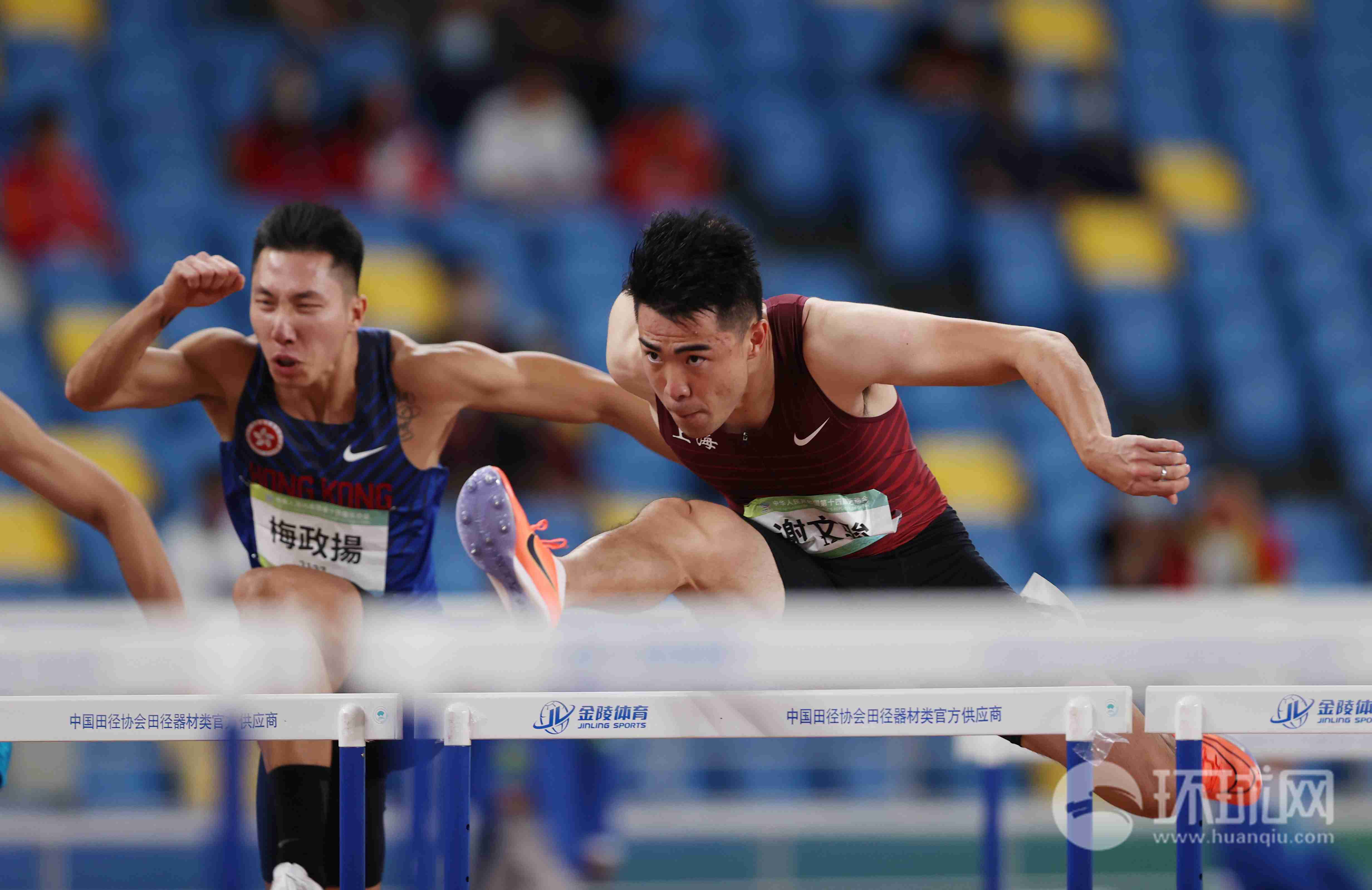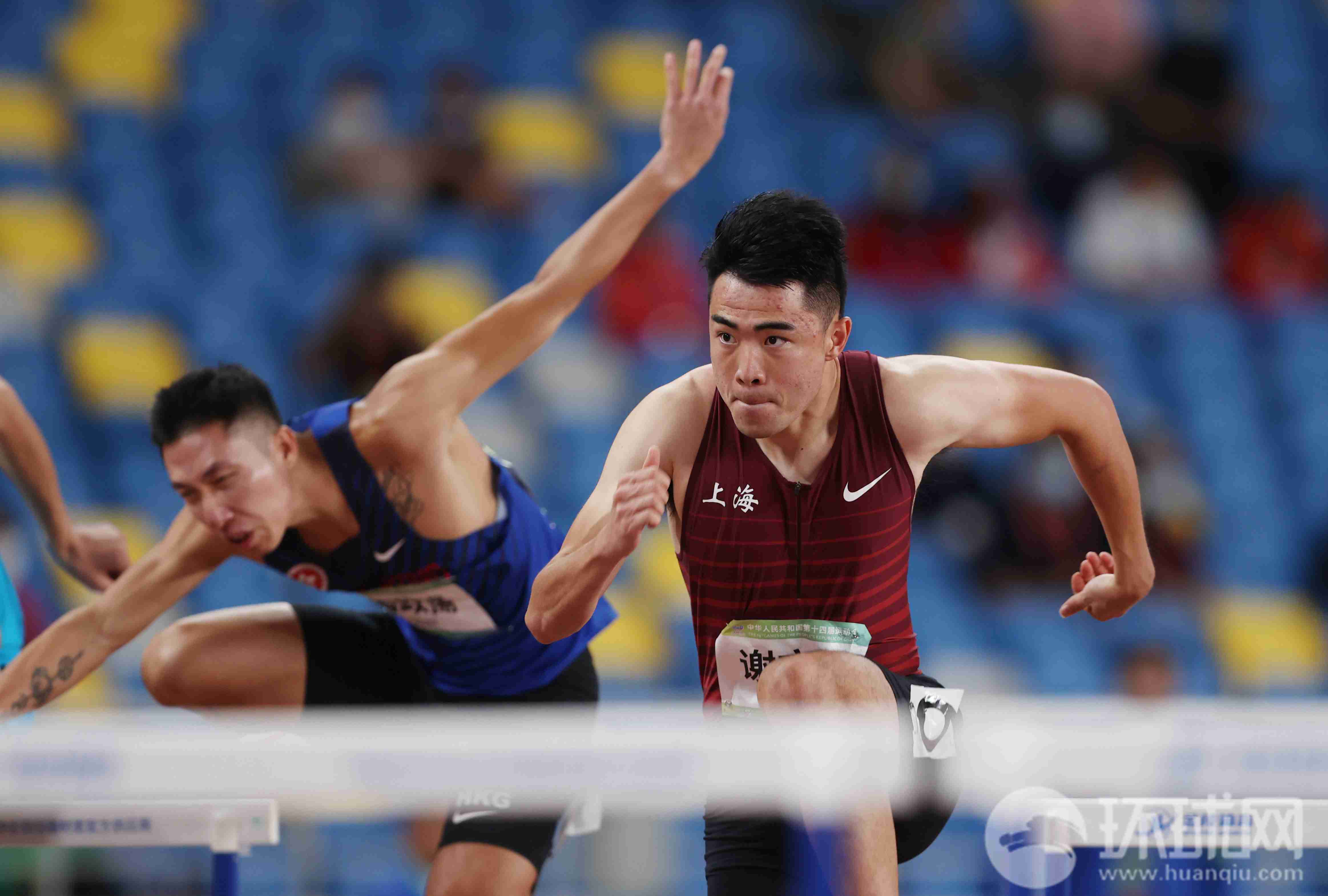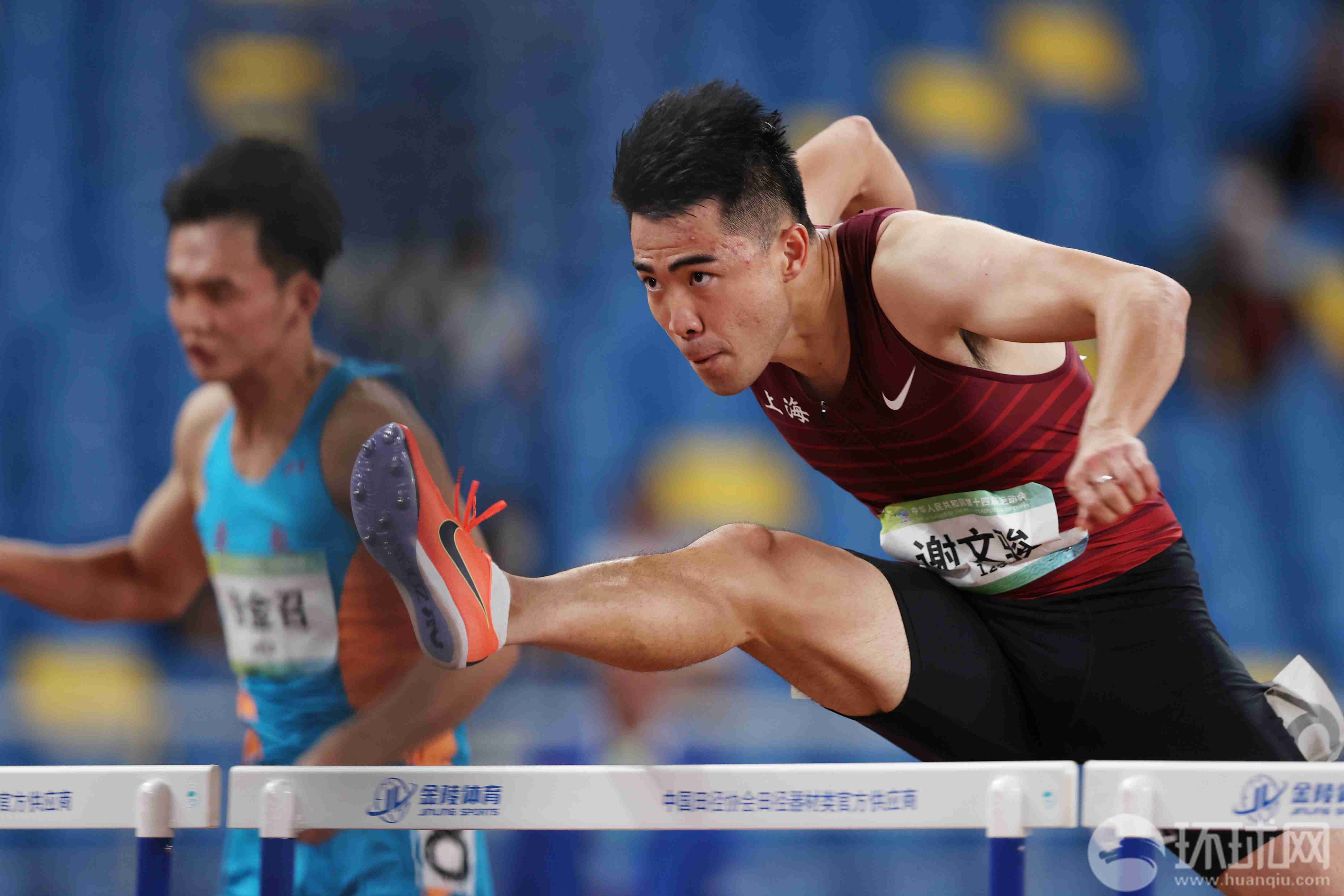 9月21日,陕西西安。上海队名将谢文骏在第十四届全运会男子110米栏预赛中跑出13秒58,尽管他的起跑反应时间稍慢,但仍然是毫无悬念的以小组第一的成绩顺利晋级。崔萌 摄