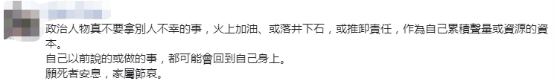 有网友认为,“政治人物真不要拿别人不幸的事,火上加油、或落井下石,或推卸责任,作为自己累积声量或资源的资本。自己以前说的或做的事,都可能会回到自己身上。愿死者安息,家属节哀。”