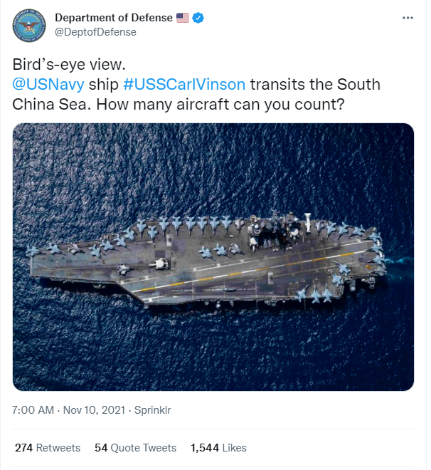 美国国防部的推文配了一张从高空俯拍的航母照片,并说:“鸟瞰图。@美国海军‘卡尔·文森’号航母经过南海。你能数出(甲板上)有多少架飞机吗?”