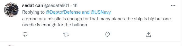 更有网友“不留情面”的说:“一架无人机或者一枚导弹就足以对付这么多飞机。这艘船很大,但(别忘了)一根针就能刺破气球。”