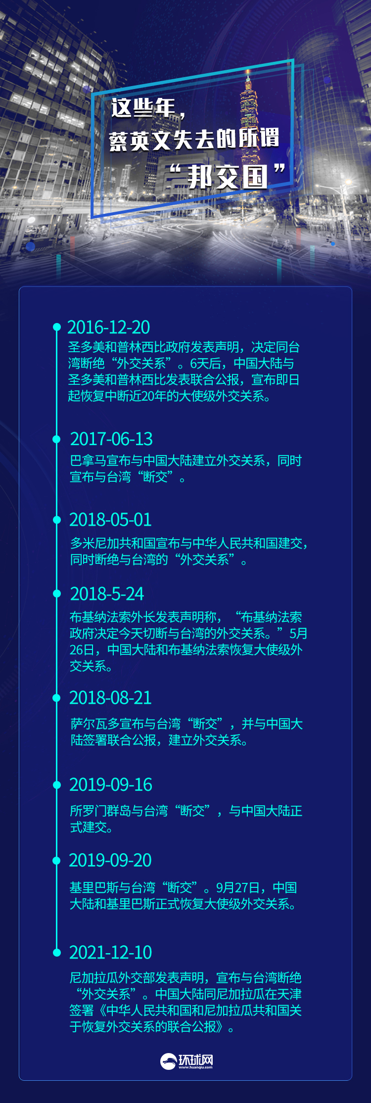 至此,蔡英文2016年上台以来,台当局已连丢圣多美和普林西比、巴拿马、多米尼加、布基纳法索、萨尔瓦多、所罗门群岛、基里巴斯、尼加拉瓜共计8个所谓“邦交国”。