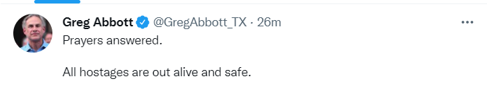 美国得州州长刚刚发文:祈祷得到了回应,人质都活着出来了
