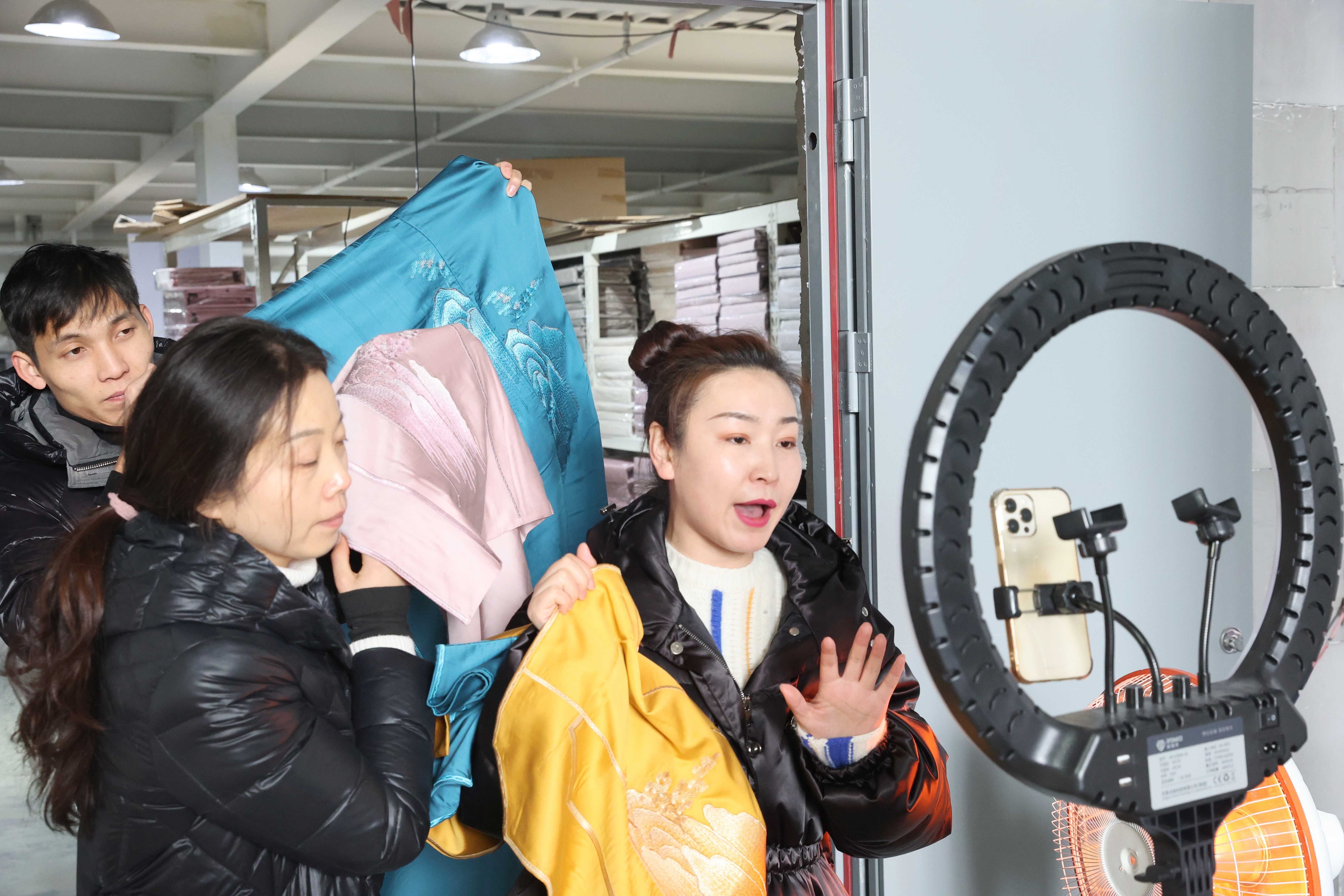 2022年1月14日在江苏南通国际家纺产业园区拍摄的家纺生产、电商直播、快递物流等画面。