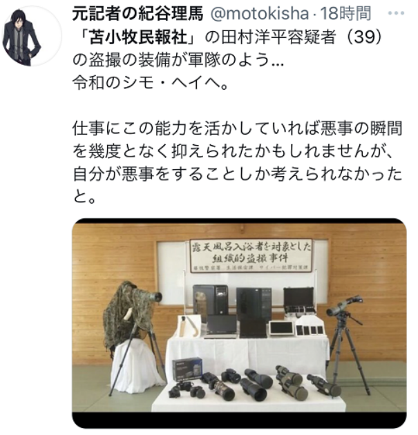 日本警方还公开了涉事偷拍团伙使用的设备,引发日本网民的议论。有不少人称他们用的设备仿佛是“谍战片中出现的”“看起来像军队装备”“让人想到狙击手”等等。针对田村,有人讽刺这就是所谓的“新闻自由”,还有人评论称:“如果将这份能力用在工作上,那可能能够抓拍到很多人做坏事的瞬间。但他却只想着自己做坏事。”↓