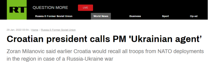 【环球网报道 记者 林泽宇】近期,俄罗斯乌克兰局势日益紧张,而就在这个问题上,北约成员国克罗地亚的总统佐兰·米拉诺维奇和总理安德烈·普连科维奇的表态针锋相对。“今日俄罗斯”(RT)网站29日报道,米拉诺维奇在接受采访时指责普连科维奇称:“他表现得像一个乌克兰特工,而我表现得像一个克罗地亚总统。”