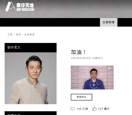 据了解,刘德华的粉丝官网“华仔天地”今天以“加油!”为题发布了相关视频,“华仔天地”的官方微博账号也转载了相关视频。