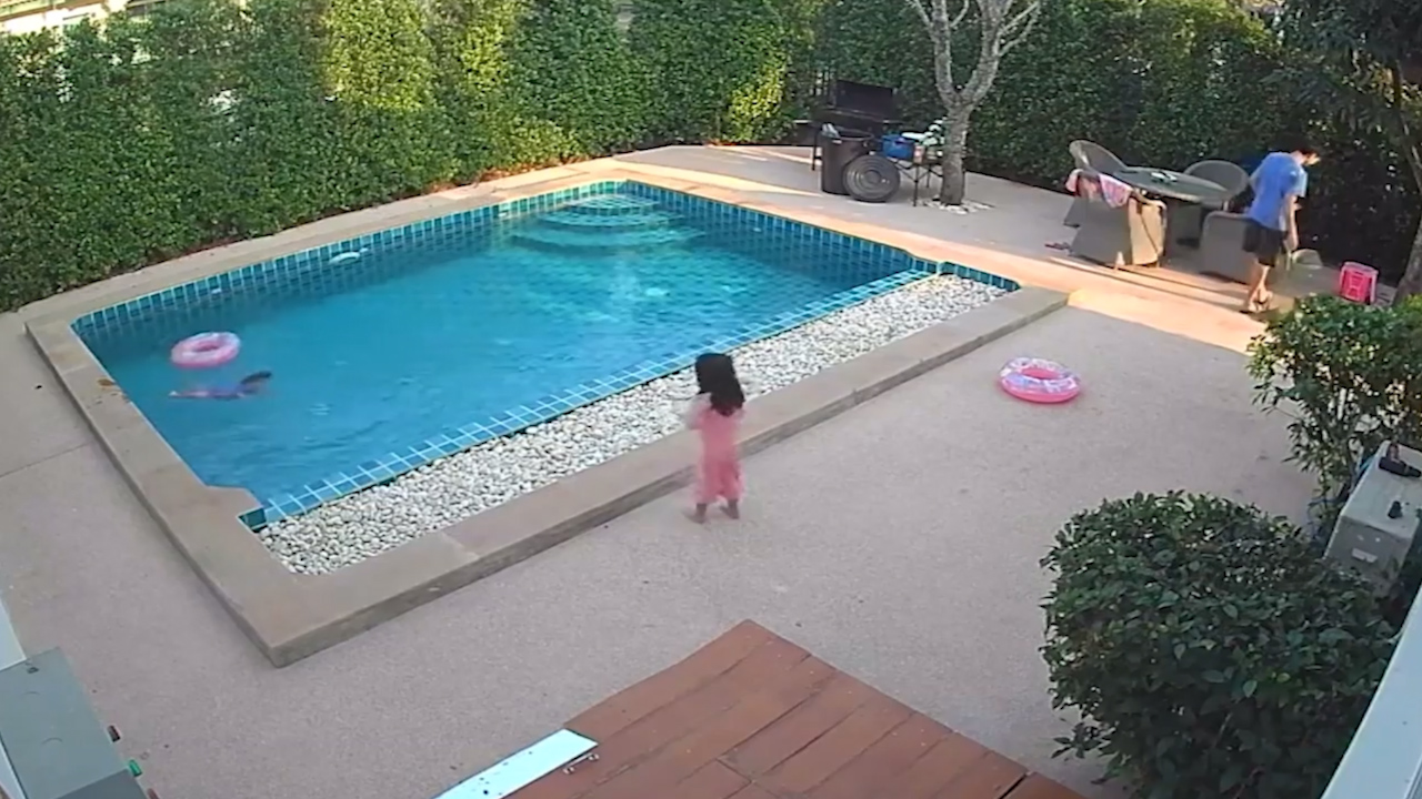 视频中,两个小女孩在花园的泳池周围玩耍,他们的爸爸则在一旁清扫落叶。此时,2岁的小女孩卡宁掉进泳池,在岸上的姐姐卡娜看到后大叫了一声,然后跑过去叫爸爸。爸爸阿皮西特立刻跳进水里将女儿救上岸边。