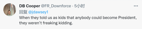 还有人嘲讽说,“当我们还是孩子的时候,他们告诉我们,任何人都可以成为总统,这可不是开玩笑。”↓