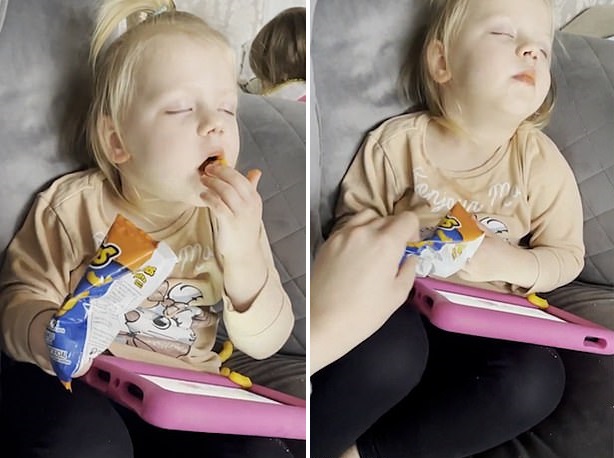 英国2岁女童不停打瞌睡 仍努力保持清醒想要吃完零食