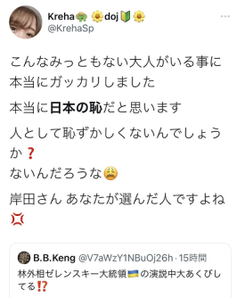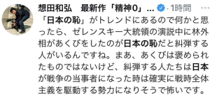 另一方面,也有人对这种批评浪潮提出疑问,日本导演想田和弘称,“看到‘日本之耻’上了热搜感到好奇,一看原来是有人痛斥外相在泽连斯基演讲是打哈欠的林芳正是日本之耻。虽然打哈欠不是能被人夸奖的好事,但当日本成为战争当事人的时候,痛斥林芳正的这些人看起来肯定会成为推进战争时期的极权主义思想的势力,令人害怕。” ↓