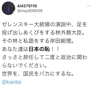 有人还拉上在直播画面中与林芳正交头接耳的日本首相岸田文雄一起批评,称:“在泽连斯基演讲时坐着把脚伸出去还打哈欠的林芳正,和林芳正开小会的首相岸田。你们是日本之耻,赶快辞职并且不要再涉足政治了,不要把国际社会和日本国民当傻瓜。” ↓