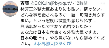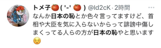 有人说:“看不少人说着什么日本之耻,但我认为仅因为对首相或大臣感到不满就铺天盖地地诽谤人的人们才是日本之耻。” ↓