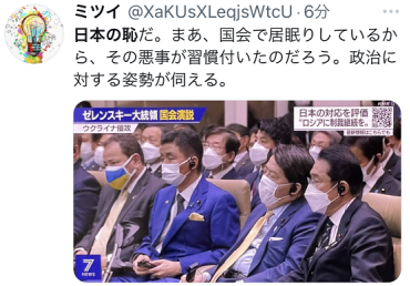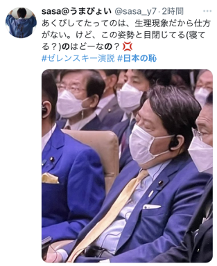 【环球网报道 记者 林泽宇】乌克兰总统泽连斯基23日在日本国会发表视频讲话,在那期间,日本外务大臣林芳正打哈欠的场景被日本广播协会(NHK)的直播画面捕捉到,让他成为日本网络舆论的众矢之的。看到该画面后,大量日本网民批评林芳正是“日本之耻”,批评浪潮将关键词“日本之耻”推上日本推特热搜话题。↓