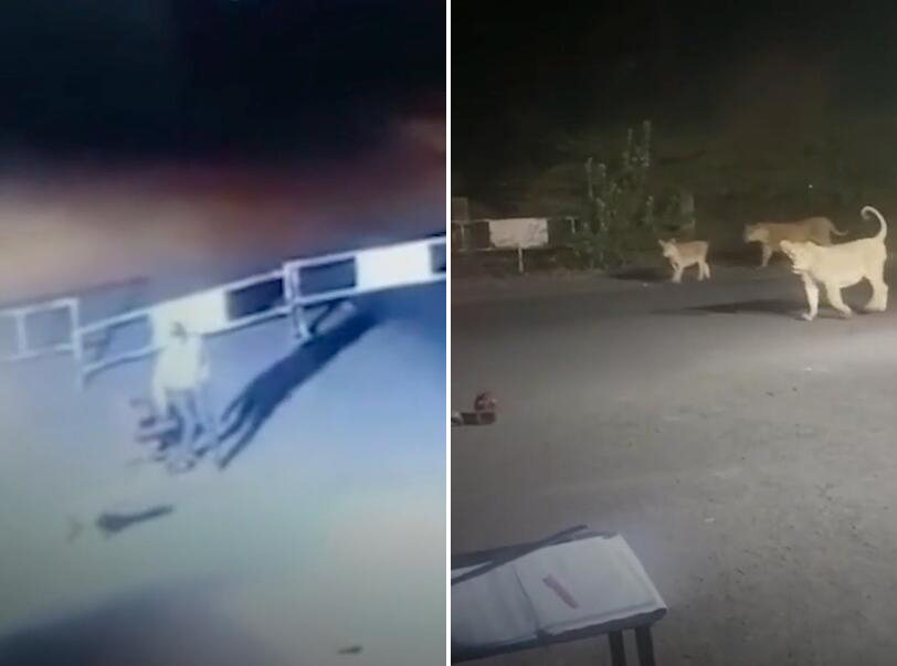 印度一群狮子晚间到一公司前漫步 保安吓得丢下椅子逃跑