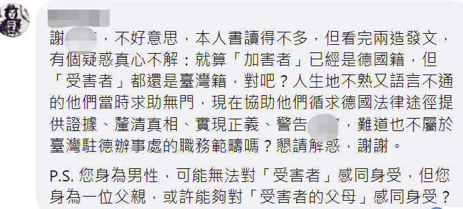 还有人问谢志伟:就算加害者已经是“德国籍”,但受害者都还是“台湾籍”,人生地不熟又语言不通的他们当时求助无门,现在协助他们寻求德国法律途径提供证据、厘清真相,难道也不属于台湾驻德机构职务范畴吗?↓
