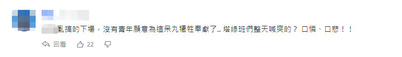 在台媒评论区,有人留言写道:“去当炮灰吗?当民众是傻子。” ↓