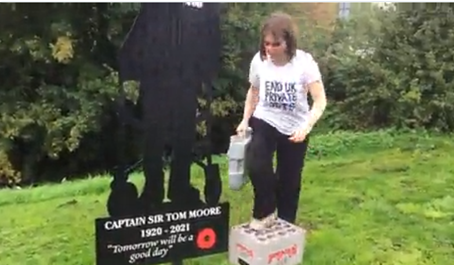 这一幕画面也被“终结英国私人飞机”的推特账号发在网上,该推特账号在描述上述举动时声称:21岁的麦迪迪·巴德说,"每有一架私人飞机起飞”,就会把一桶污秽物倒在象征老兵汤姆的纪念物上。