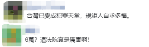 对于这一结果,令一些岛内网友质疑:“台湾已变成犯罪天堂,规矩人自求多福。”“6万,这法院真是厉害啊!”
