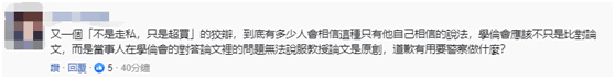 还有人认为他是在狡辩,“到底有多少人会相信这种只有他自己相信的说法,学伦会应该不只是比对论文,而是当事人在学伦会的对答论文里的问题无法说服教授论文是原创,道歉有用要警察做什么?”↓