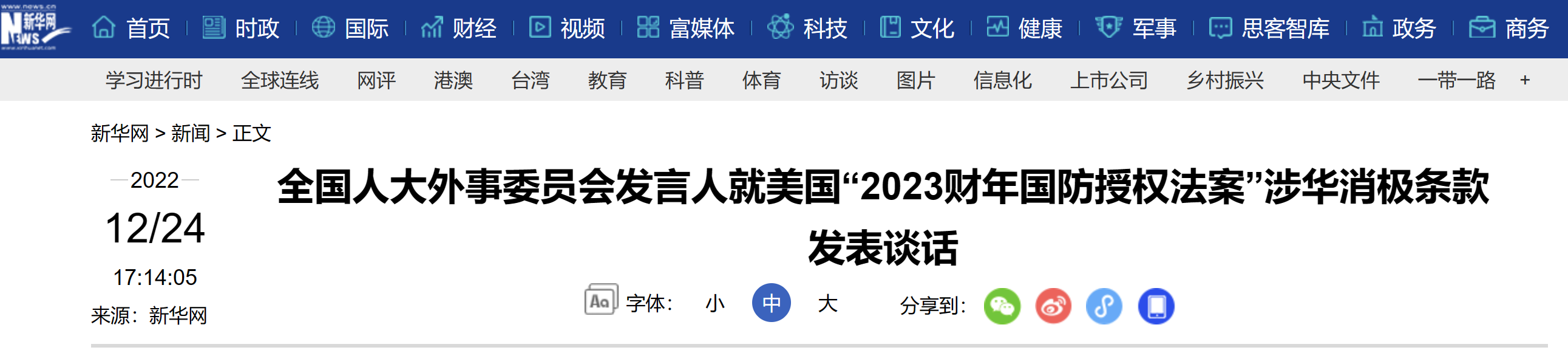 三、全国人大外事委就美“2023财年国防授权法案”涉华消极条款发表谈话