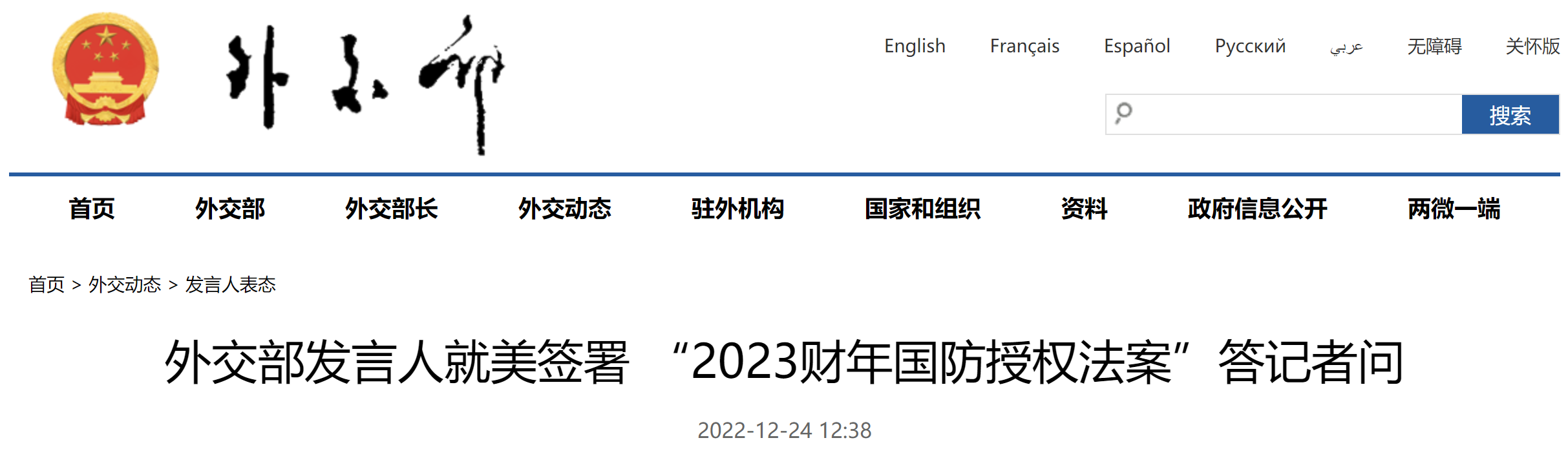 一、外交部发言人就美签署 “2023财年国防授权法案”答记者问