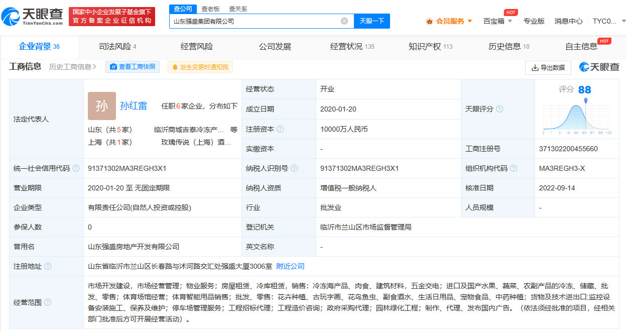 工商信息显示,山东强盛集团有限公司成立于2020年1月,曾用名为山东强盛房地产开发有限公司,法定代表人为孙红雷,注册资本1亿人民币,经营范围包括市场开发建设、市场经营管理、物业服务、房屋租赁等。知识产权信息显示,该公司已成功注册多枚“强盛集团 QIANGSHENG GROUP”商标。