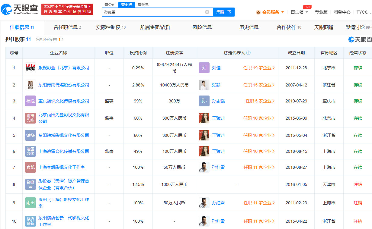 天眼查App显示,演员孙红雷共关联11家公司,目前共有7家为存续状态,包括由其个人独资的上海春凯影视文化工作室,以及由其持股的乐视影业(北京)有限公司、东阳青雨传媒股份有限公司、重庆福悦文化传媒有限公司、北京雨田先锋影视文化有限公司、东阳铁塔影视文化有限公司、上海迪雷文化传播有限公司,其商业版图均为影视传媒、文化传播相关,与山东强盛集团有限公司并无商业关联。