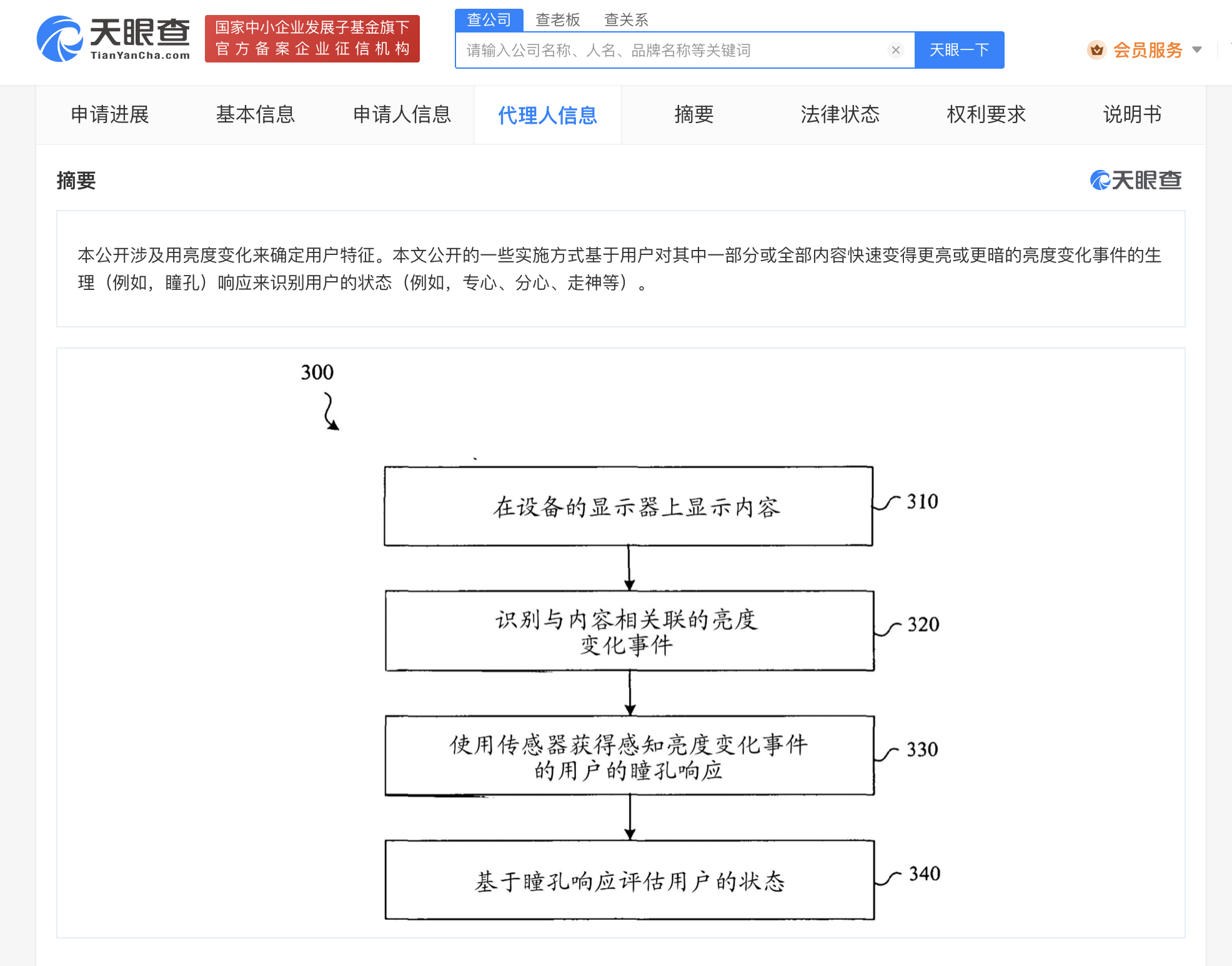 天眼查App显示,根据摘要,该专利是基于用户对一部分或全部内容,快速变得更亮或更暗的亮度变化的生理(例如,瞳孔)响应,来识别用户的状态(例如,专心、分心、走神等)。