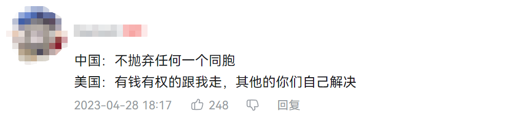 这段视频引起很多网友的讨论,其中有网友简单总结了中美撤侨行动的不同。↓