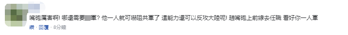 还有网友讽刺赵天麟“嘴炮”,“哪还需要台军?他一人就可吓阻解放军了,这能力还可以反攻大陆呢!赵嘴炮上前线去任职,看好你一人军。” ↓