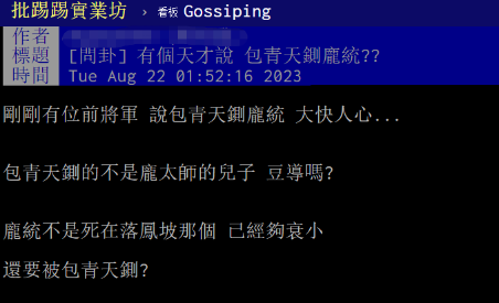 在岛内网络论坛PTT上,也有网民称:“包青天铡的不是庞太师的儿子吗?”↓