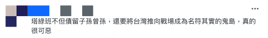 “塔绿班不但债留子孙曾孙,还要将台湾推向战场成为名副其实的鬼岛,真的很可恶”。