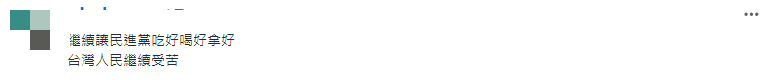 还有岛内网民表示,“继续让民进党吃好喝好拿好,台湾人民继续受苦”。