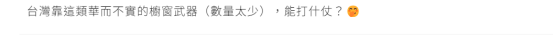 消息传到岛内,引发岛内网友关注。有网友批美对台军售是在“骗台湾钱,卖台湾破铜烂铁”,有网友对美军的交货速度提出质疑,“50枚导弹要花4年?”还有网友嘲讽台当局购买50枚空地导弹仅能当作展示品,战时只能用来塞牙缝,“台湾靠这类华而不实的橱窗武器,能打什么仗?”此外,更有网友点出,“对美国来说,台湾唯一的价值就是反华的牺牲品。”