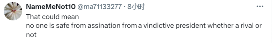 也有不少人质疑这种说法,“如果最高法院同意,总统可以对暗杀竞争对手的行为享有豁免权,那么如果我们被视为‘威胁’,我们这些普通公民又有什么机会免受总统的迫害、监禁或处决呢?”↓