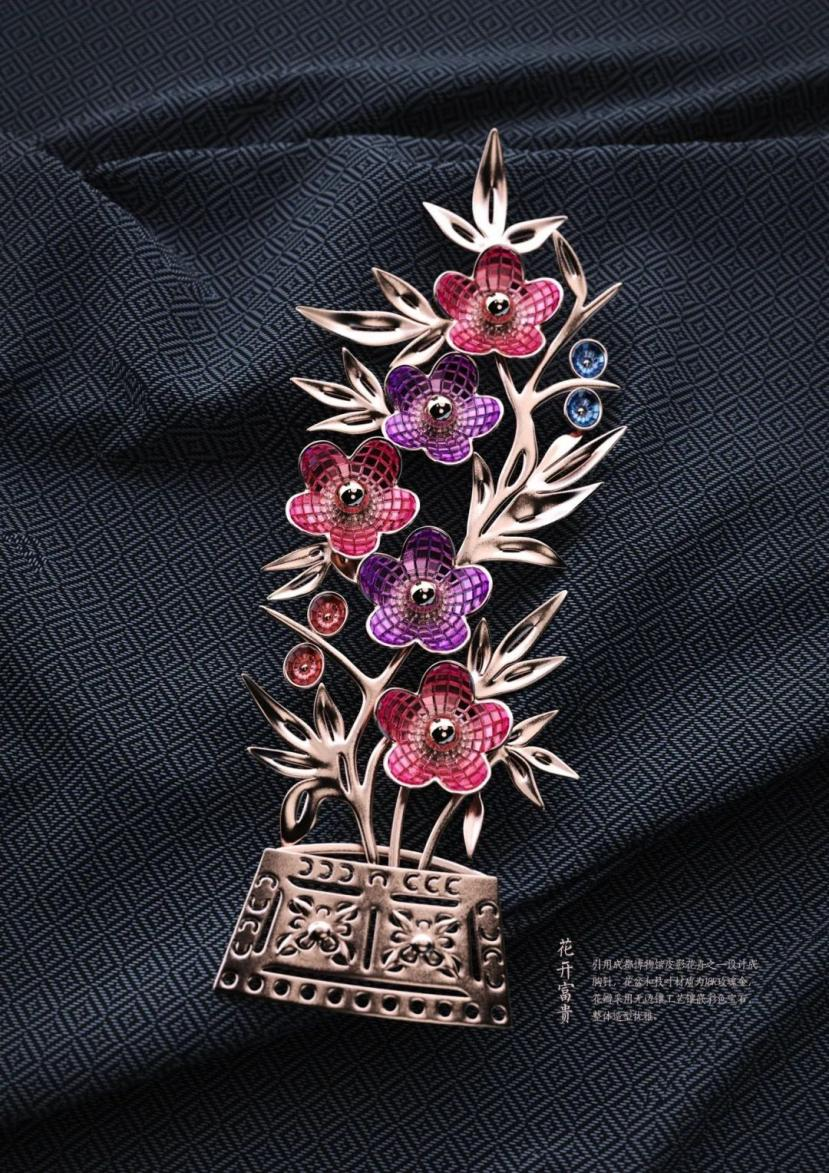•作品亮点:引用成都博物馆皮影花卉之一设计成胸针,花盆和枝叶材质为18k玫瑰金,花瓣采用无边镶工艺镶嵌彩色宝石,整体造型优雅。