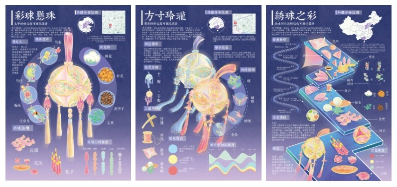 •作品亮点:本次设计以非遗绣球为设计目标,选取广西与太平地区的特色绣球为代表向大家展示中国传统之美。运用创意图表,将绣球的发展历程展现,并引导观众深入了解绣球的制作工程,了解绣球的传奇历程,特殊的制作工艺,深入了解绣球的文化底蕴。通过缤纷的色彩,生动的画面像大家展示我国传统文化的独有魅力。