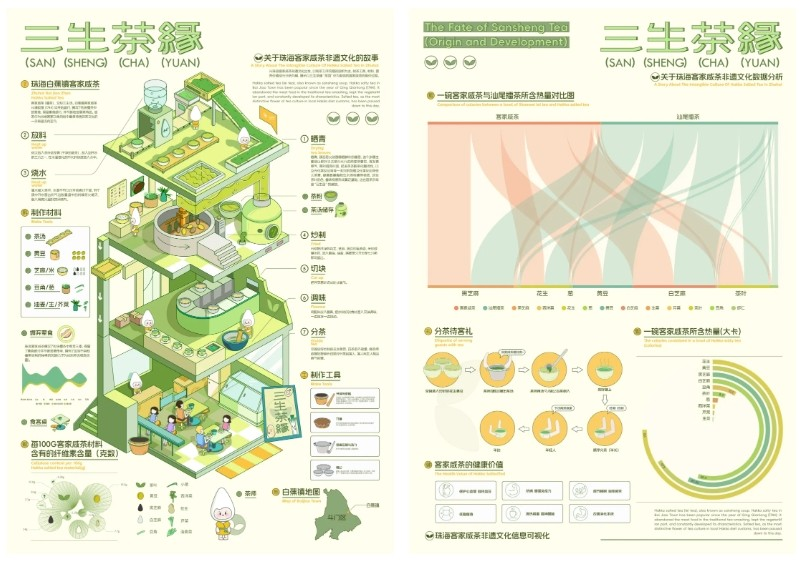 •作品亮点:从珠海市斗门区白蕉镇客家咸茶这一饮食非遗文化出发,以制茶工序流程的剖析为主,制茶工具、食材、茶师分茶礼仪、营养价值成分分析为辅,展示分析了以三生茶缘“茶馆”作为载体的客家咸茶的制作过程和其珍贵的非遗文化。通过推广客家咸茶非遗文化,可以促进乡村旅游发展,带动当地经济繁荣,助力乡村振兴战略的实施。
