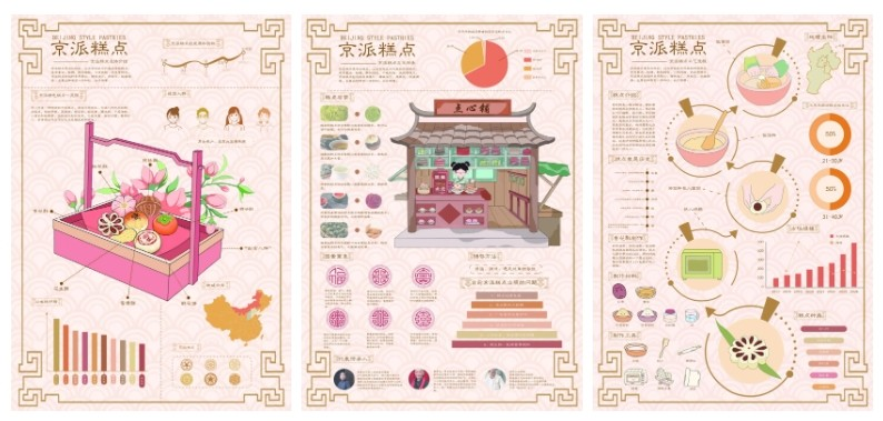 •作品亮点:本次设计以中式传统糕点中的京派糕点为主题,通过总体介绍到文化传承再到工艺流程进行信息可视化设计。深入挖掘京派糕点制作工艺的图像特征和文化内涵信息,同时采用统计图表、分析图示等多种形式将结果清晰,直观的展现出来,以准确地传达京派糕点的信息,使人们更加清晰了解京派糕点文化,更好的保护和发扬中国非物质文化遗产。