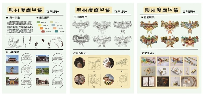 •作品亮点:荆州磨鹰风筝属湖北省非物质文化遗产,磨鹰风筝是现代盘鹰风筝的鼻祖,且与楚文化凤图腾、荆楚“磨鹰斗犀牛”的民间传说有关。本设计提取了磨鹰风筝的外形,荆州著名三大节日习俗,六大著名古建筑和景点将磨鹰风筝更好地与文创产品相结合,有利于荆州地区非遗文化的发展和传播,也有利于磨鹰风筝文化的推广和制作技艺的传承。