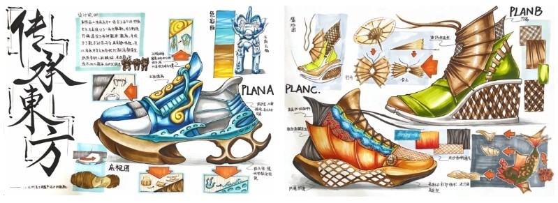 •作品亮点:本作品《传承东方》结合了各个非物质文化元素设计了一系列鞋靴,用了刺绣竹编造型了各种鞋帮、鞋底,并给予了鞋子动态开合,具有趣味性。可以传承中华文化与现代潮流相结合,抓住年轻人的眼球。采用新型技术加入鞋子,与时代俱进。