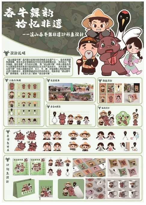 •作品亮点:作品以“春牛舞韵拾忆非遗”为主题,旨在通过设计一系列卡通形象,传承和推广非物质文化遗产——春牛舞。设计中包含了老爷、长工、牛、白鹤、村姑等角色,每个角色都有独特的表情和动作。IP衍生设计:制作了多种衍生产品,如笔记本、钥匙扣、抱枕等,将卡通形象应用于日常生活中,增强了品牌影响力。