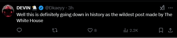 还有网友评论称,“好吧,这是白宫发布的最疯狂的帖子,绝对会载入史册。”
