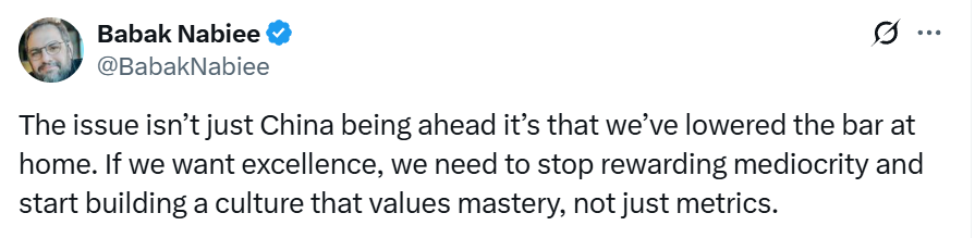 一名美国网友说,“问题不仅仅在于中国领先,还在于我们降低了国内标准。如果我们要追求卓越,就需要停止奖励平庸,开始建立一种重视精进而非仅仅追求指标的文化。” ↓