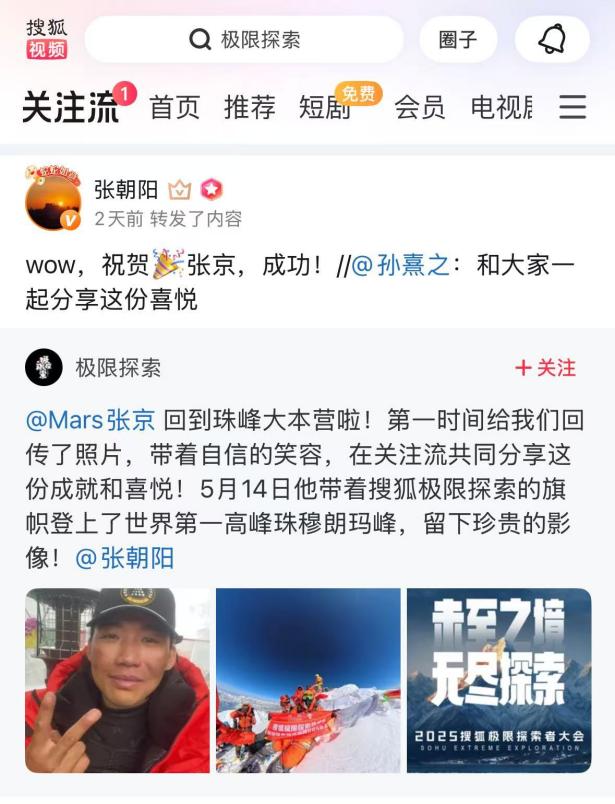 值得一提的是,5月14日,极限运动员张京带着搜狐极限探索的旗帜登上了世界第一高峰珠穆朗玛峰,并在搜狐视频关注流分享了自己的成就和喜悦。张朝阳转发并送上祝福,“wow,祝贺张京,成功!”6月5日,张京也将亮相本届大会,首度分享自己刚刚完成的珠峰洛子峰双登及国人珠峰首滑挑战背后的惊险故事和8000米生存法则。