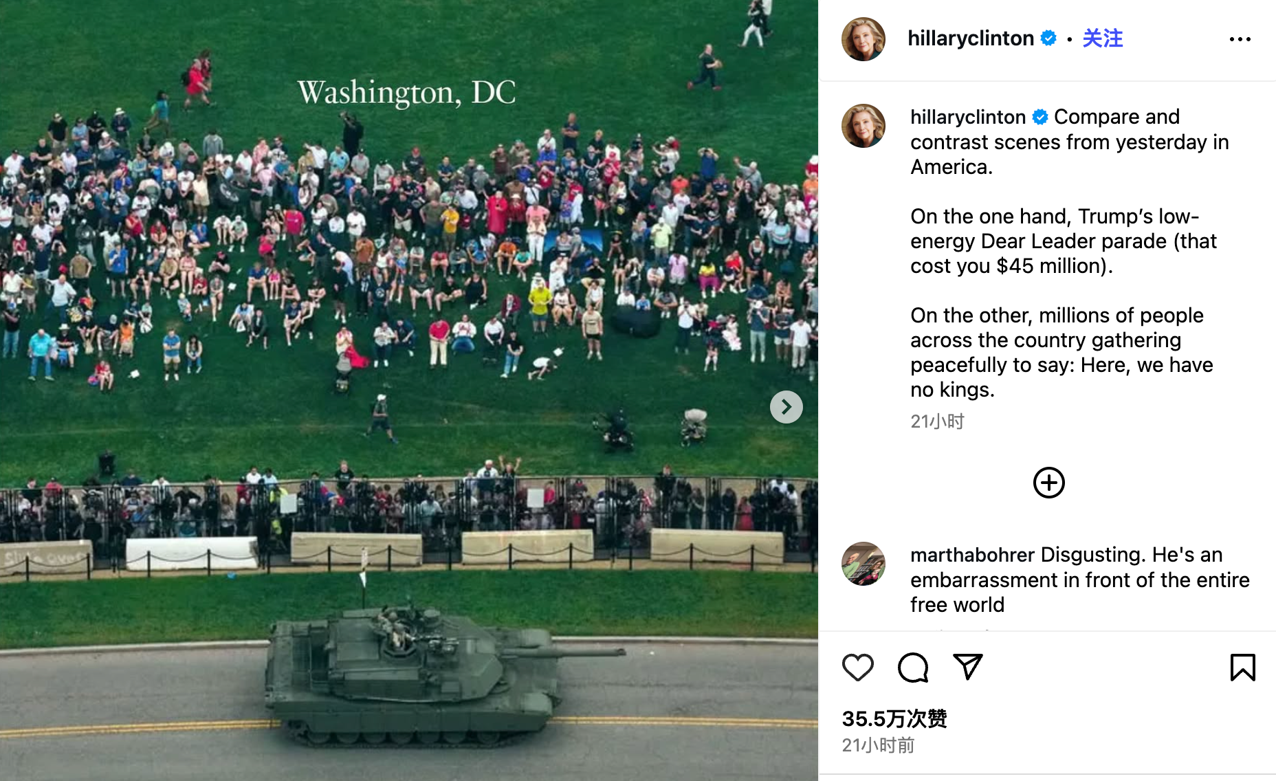 “对比一下美国昨天的场景。一方面是特朗普低能量的‘亲爱的领袖’阅兵式(耗资4500万美元)。另一方面,全国各地数百万人举行和平集会,以表示:在这里,我们不要国王”,希拉里配文称。