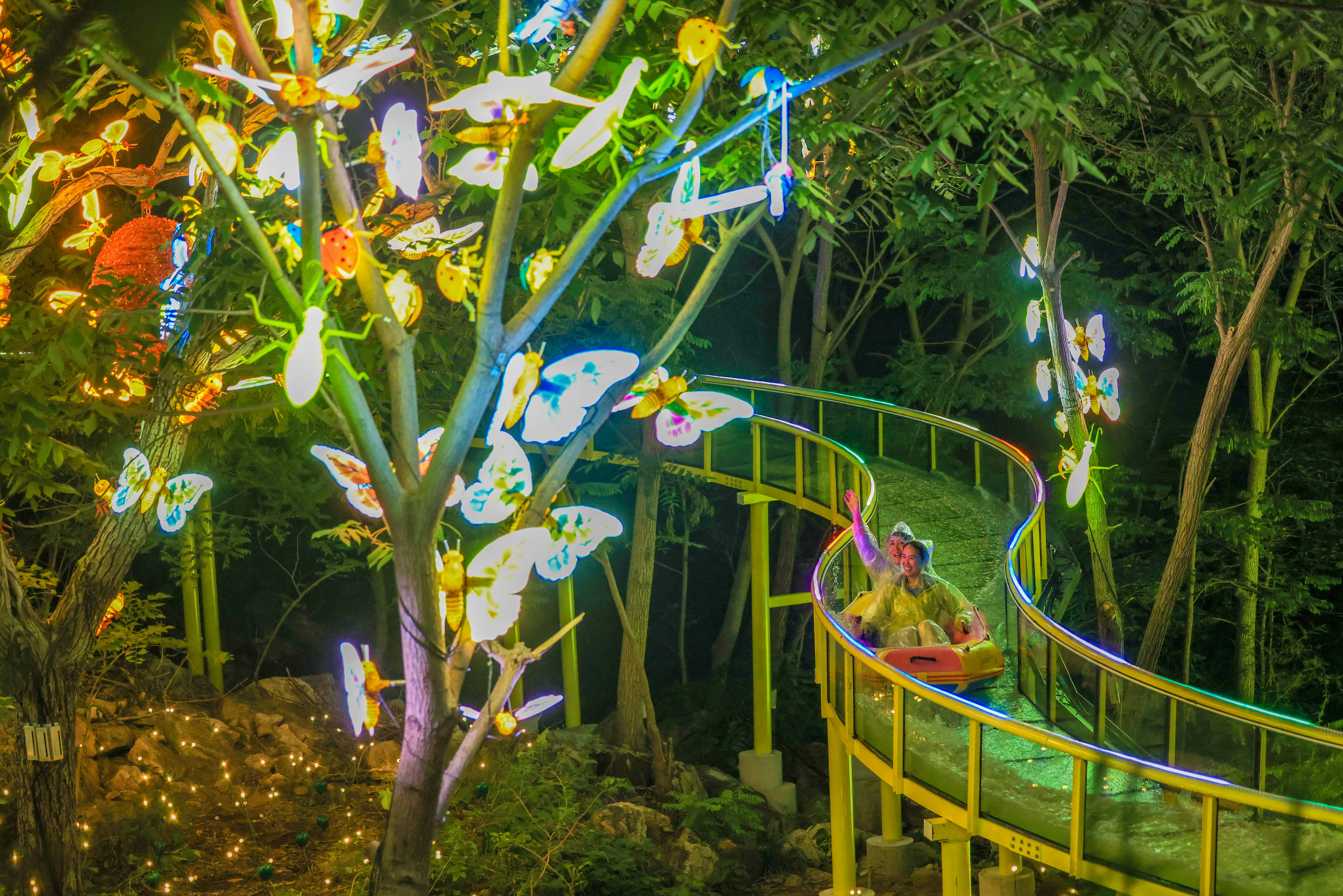 “我们这里的夜间漂流,是北京首家夜间漂流项目。”景区工作人员介绍,每周五、周六以及节假日的晚上,梨树沟休闲谷都会举办夜游活动, 游客可在霓虹灯带环绕的玻璃水滑道上体验“追光漂流”,沿途穿行激光投影、雾森系统等互动装置,配合山顶水舞秀的3D投影与音乐喷泉,体验“水上银河”的梦幻场景。