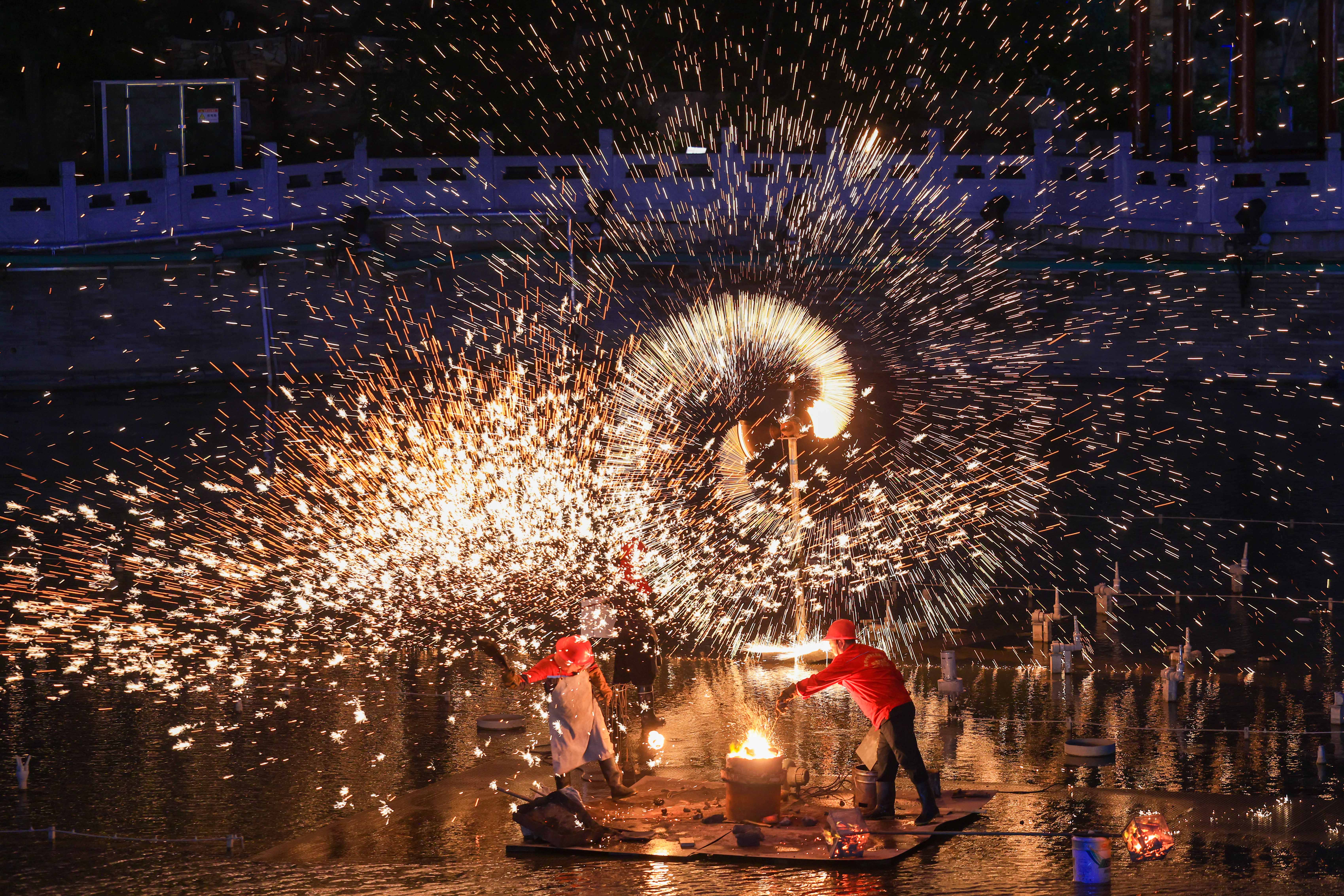 傍晚时分,梨树沟夜游与游客如约见面。大型实景水秀“平谷夜话”上演,利用现代舞美技术,结合音乐、喷泉、灯光、激光、投影等元素,为游客呈现一场精彩的光影盛宴。打铁花四溅如星雨,引起阵阵惊呼喝彩。在处处流光溢彩中,游客又开始了夜间漂流。