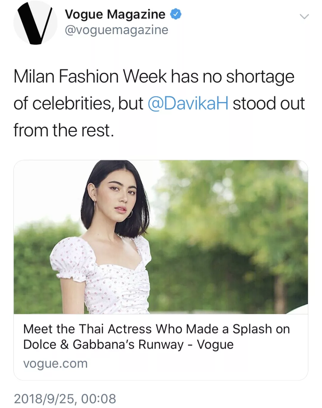 见多识广的《Vogue》也特地发文夸她:众星云集的米兰时装周,但Mai脱颖而出了。