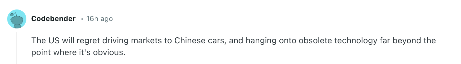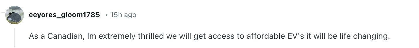 有自称是加拿大人的网友表示不仅不后悔,还很“激动”:“作为一名加拿大人,我为我们将能买到能负担得起的电动汽车而非常激动,这将改变我们的生活。”↓